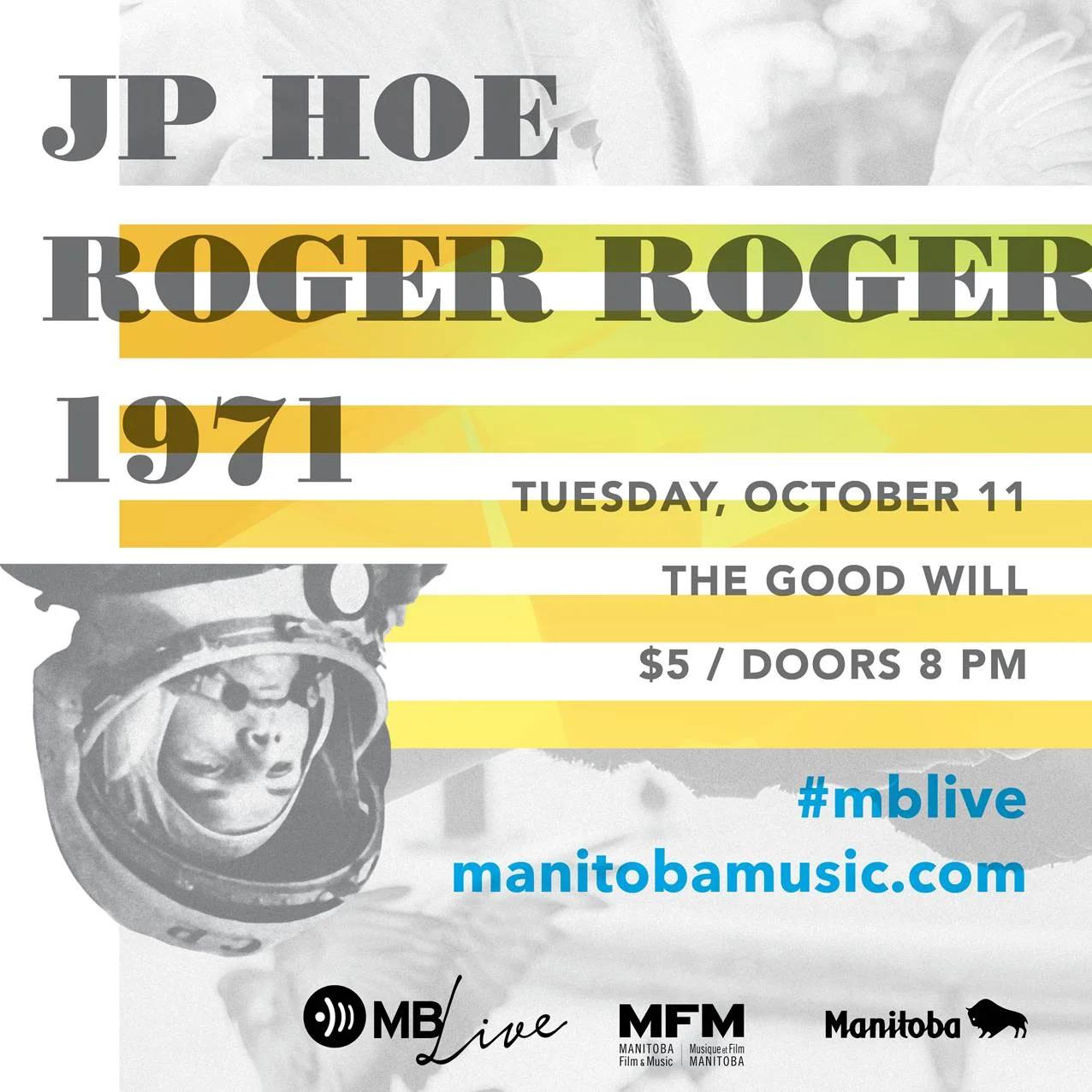 WINNIPEG, MB - The JP Hoe band will be playing a short set for a Manitoba Music event at the Goodwill in Winnipeg Tuesday October 11, 2016. Also on the bill 1971, and Roger Roger. $5 tickets at the door.